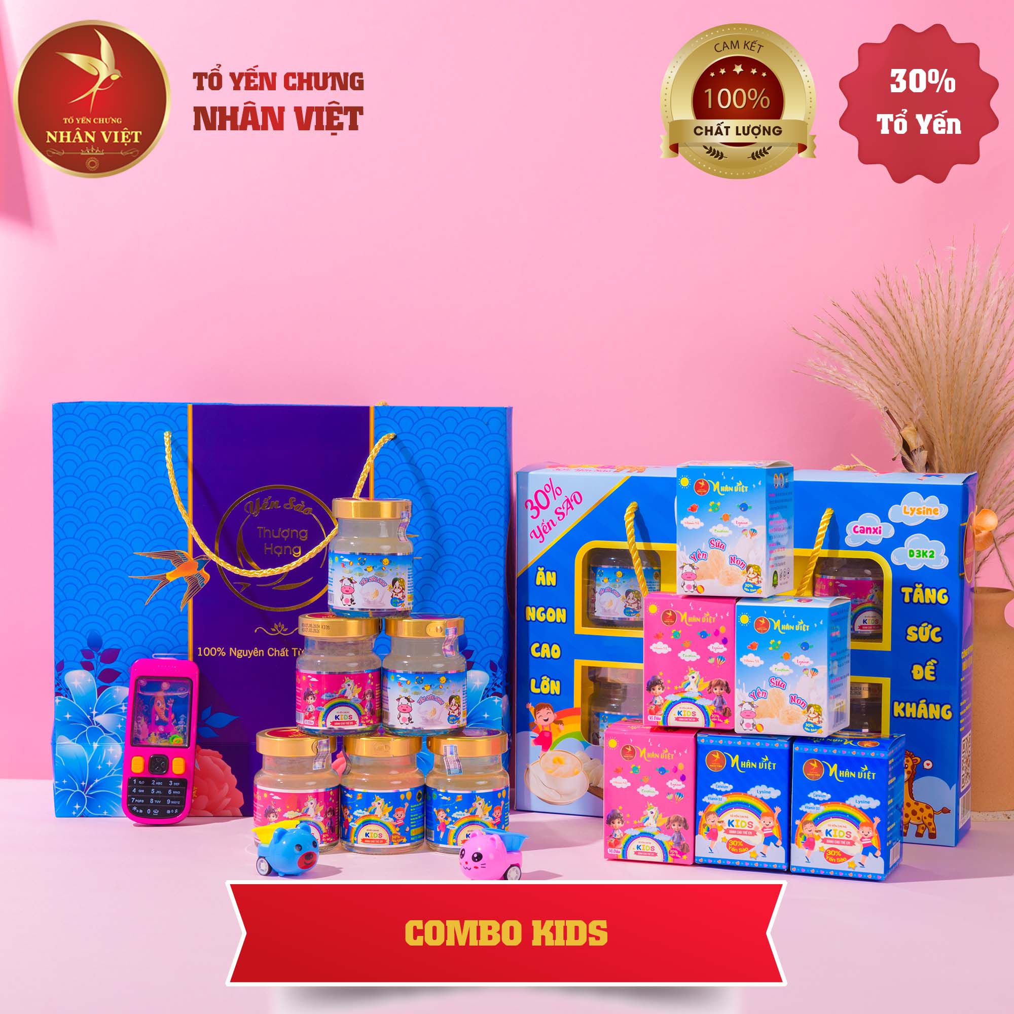 - Yến hũ Kids Sữa non Nhân Việt (30% yến) dành cho trẻ em là một món ăn được chế biến từ 30% tổ yến thô nguyên chất chưng cất cùng đường phèn, sữa non và các loại vitamin khoáng chất cần thiết cho trẻ phát triển như: Canxium, Lysine, Taurine,và Các Vitamin D3, K2, …