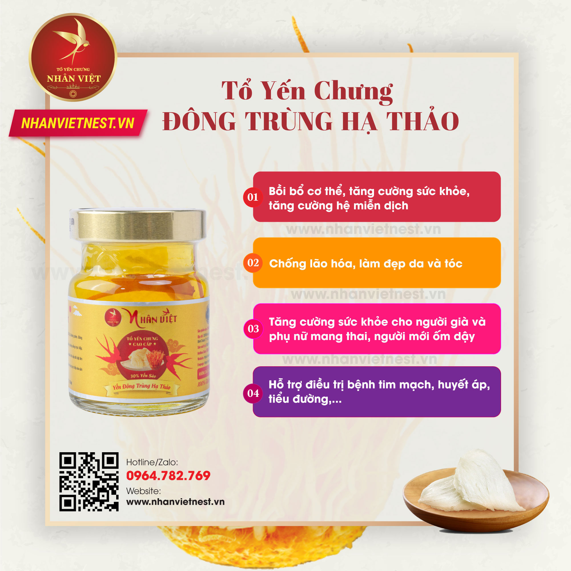 Yến hũ chưng Đông Trùng Hạ Thảo NHÂN VIỆT được chế biến từ nguyên liệu chính là 30% yến sào nguyên chất và Đông Trùng Hạ Thảo nên có công dụng của cả hai loại thực phẩm quý giá này.